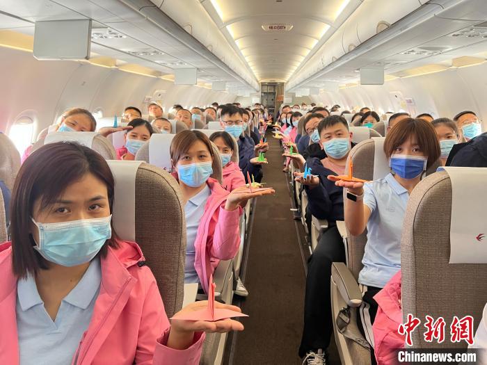 東航機組制作了寓意“美好、希望、祝?!钡那Ъ堹Q送給援藏醫(yī)護隊員,希望醫(yī)護隊員們平平安安歸來,祝福自治區(qū)各族同胞早日戰(zhàn)勝疫情。