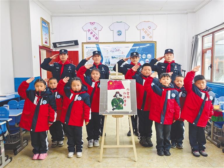 圖為玉麥邊境派出所民警、玉麥鄉(xiāng)小學(xué)學(xué)生與雷鋒畫像合影。 通訊員 扎西根培 記者 張宇 攝