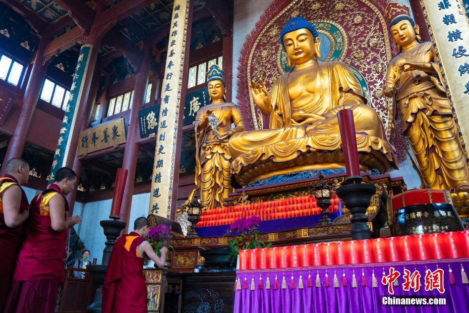 5月16日至18日,西藏少年活佛參學(xué)團(tuán)赴浙江參觀學(xué)習(xí),感受江南水鄉(xiāng)綿延的歷史人文底蘊(yùn)。圖為5月16日,西藏少年活佛參學(xué)團(tuán)在普陀山普濟(jì)禪寺誦經(jīng)禮佛。