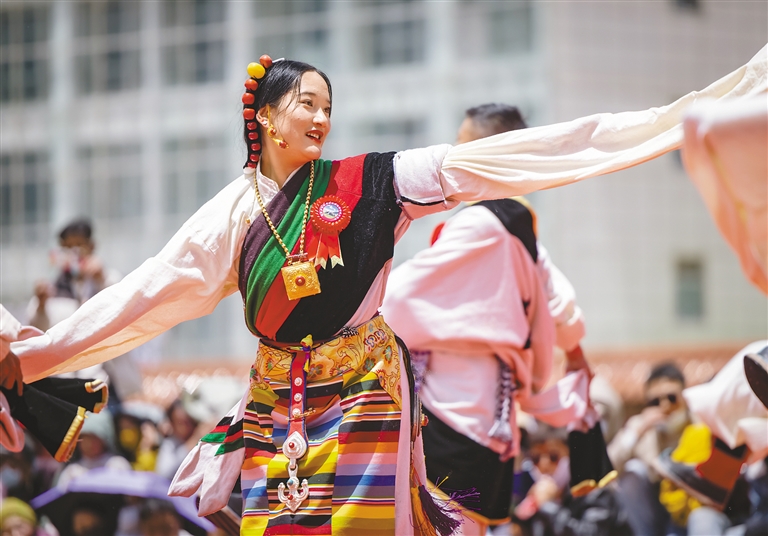 身著特色藏族服飾的巴青縣群眾在“鄉(xiāng)村振興 那曲奮進(jìn)”傳統(tǒng)舞蹈大賽上表演舞蹈。