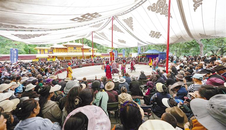 圖為8月8日,市民群眾在羅布林卡觀看藏戲。