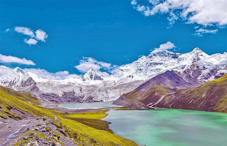 薩普雪山2016年才被發(fā)現(xiàn)并面世,是一處保護(hù)非常完整的天然冰川。其主峰海拔為6956米,北側(cè)有巨大的薩普冰川,冰川末端有一湖泊叫薩姆錯(cuò),海拔約4750米,薩姆錯(cuò)分內(nèi)、外湖,內(nèi)湖為崗香童錯(cuò)冰湖,終年不化,一年四季漂浮千年冰雕,形狀各異;外湖湖水碧綠,湖內(nèi)魚兒成群。