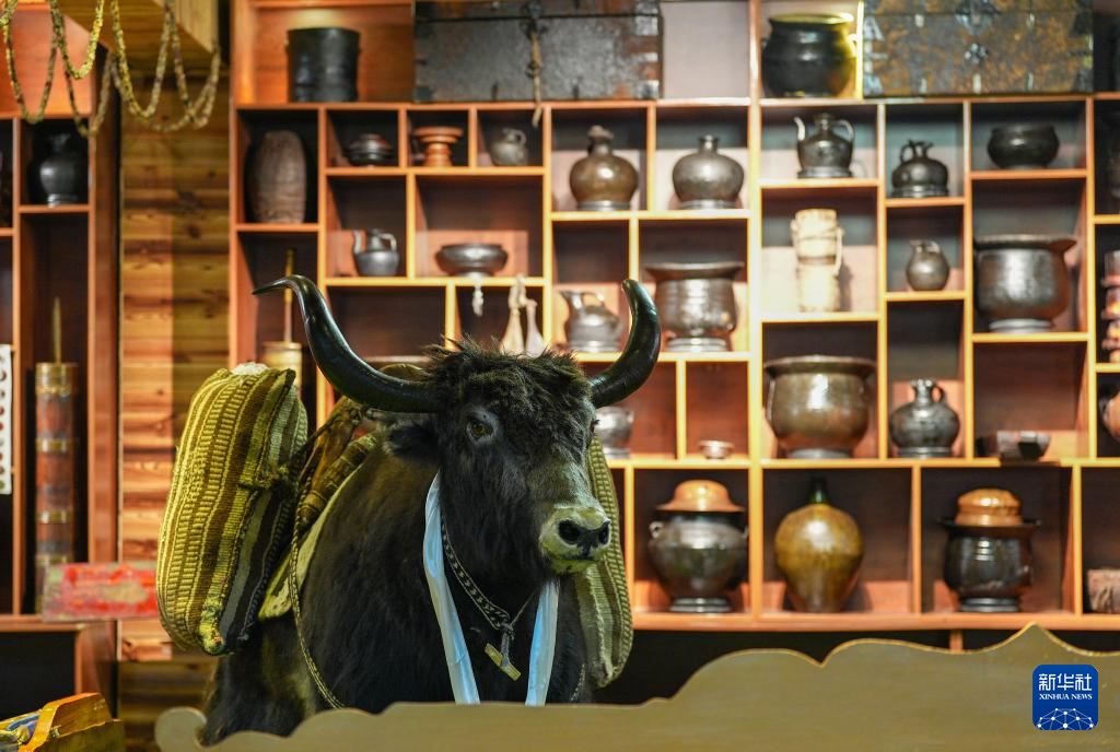茶館主人珠珠將藏式茶館與民俗陳列方式相結(jié)合,讓顧客在品嘗美食的同時(shí),沉浸式體驗(yàn)民俗文化。茶館四周和過(guò)道上擺滿(mǎn)700余種3000多件西藏民俗物件,有給牛犢喂奶的牛角奶瓶、火柴盒大小的便攜酥油盒、防沙塵和雪盲的牦牛毛墨鏡等。牧民生產(chǎn)生活用具幾乎都能在這里找到,獨(dú)具風(fēng)格的茶館儼然成為一座藏北游牧文化“博物館”。
