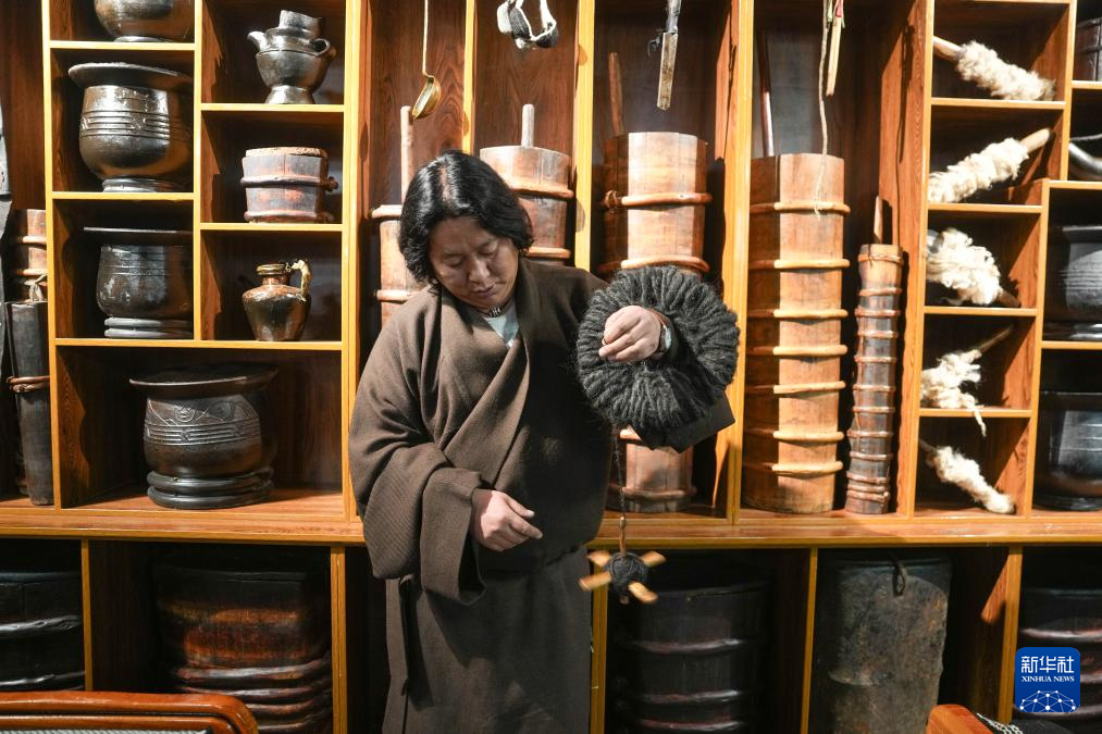 “牧人寶庫(kù)”藏式茶館主人珠珠演示紡羊毛線(xiàn)用的工具(2月13日攝)。新華社記者 晉美多吉 攝