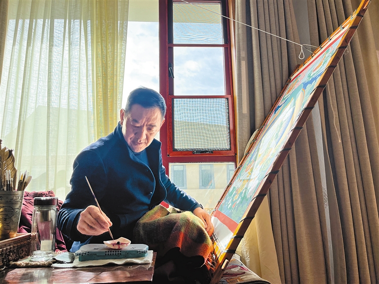勉沖·羅布斯達(dá)在繪制唐卡。記者 丹增平措 次旦央吉 攝