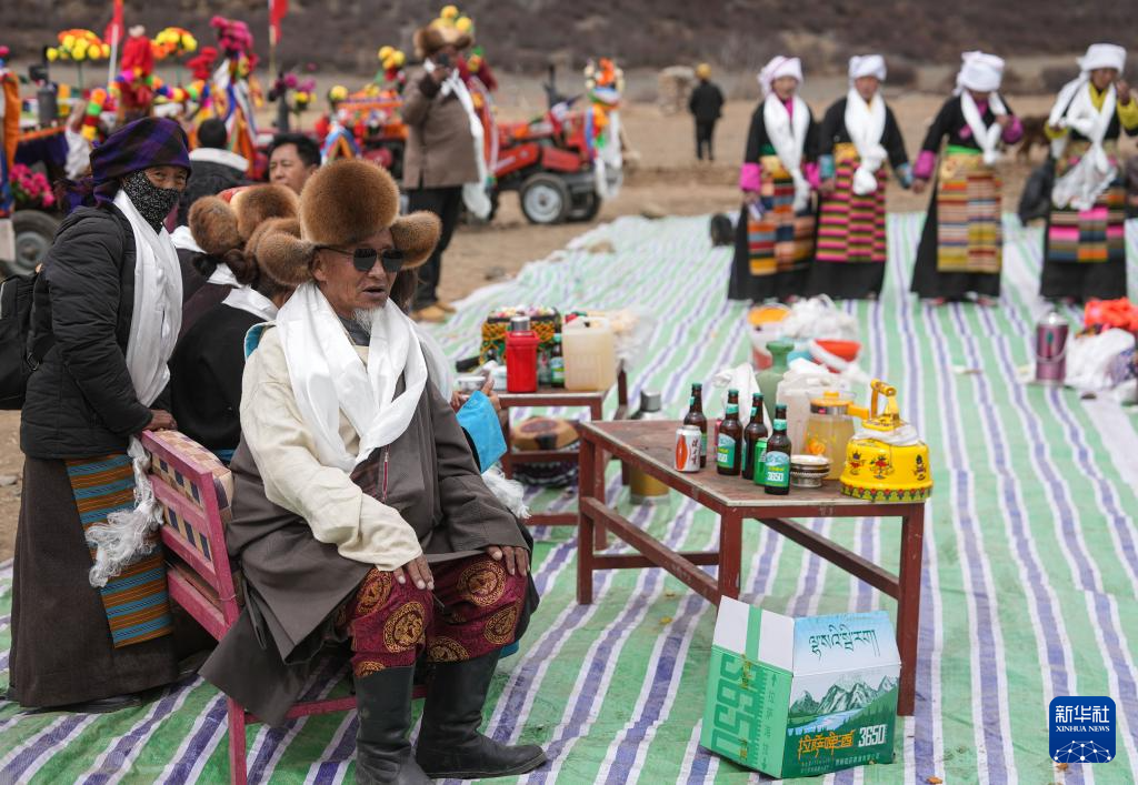 旺慶老人(前)在春耕大典上看著年輕人跳舞(3月16日攝)。新華社記者 晉美多吉 攝