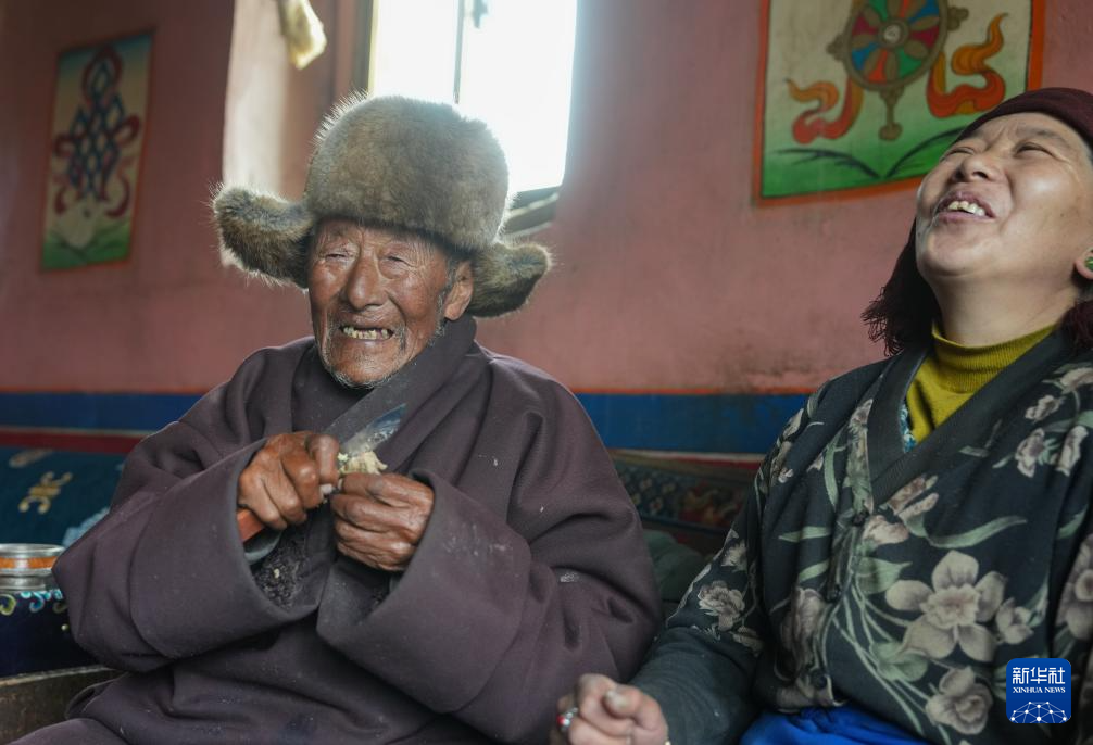 索扎老人和家人一起分享食物(3月20日攝)。新華社記者 晉美多吉 攝