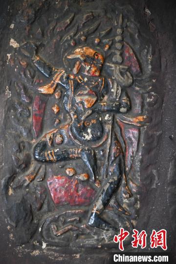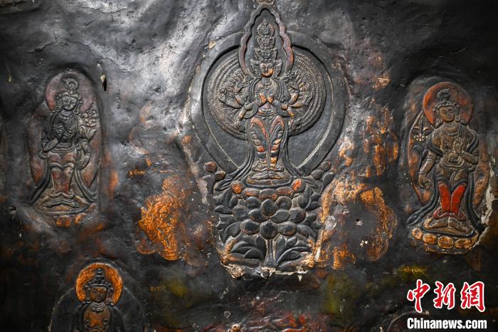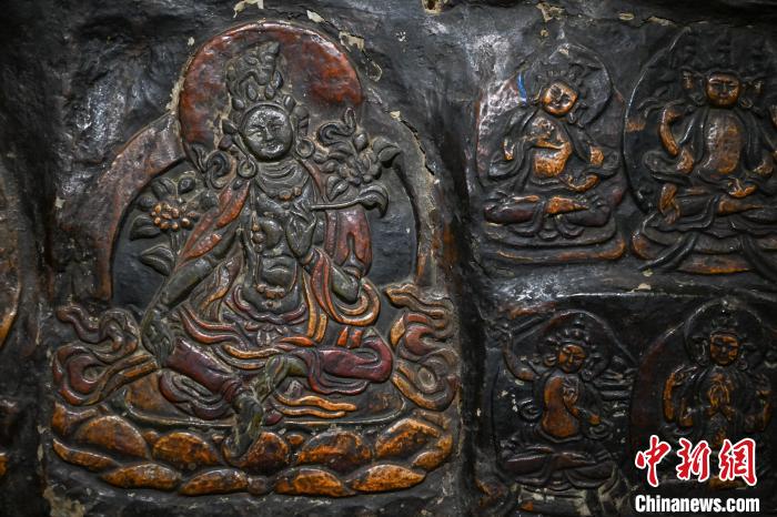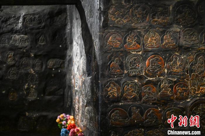 4月27日,記者探訪了當(dāng)雄縣貢堂鄉(xiāng)沖嘎?tīng)柎蹇雕R寺的瑪尼拉康?,斈崂凳窃撍鲁扌卸粗獾脑缙谧诮袒顒?dòng)場(chǎng)所,也是寺院里最古老的建筑。這里保存著令人驚嘆的石刻造像墻,這些石刻距今已有三百年歷史?,斈崂低庥^普通,但其室內(nèi)六面墻上整齊地貼滿(mǎn)了浮雕石刻板,共計(jì)1213塊(僅一塊缺失)。石刻內(nèi)容豐富,涵蓋了藏傳佛教各宗各派的本尊、祖師、佛母菩薩等,造型多姿多樣,線條清晰流暢。這處石刻造像墻對(duì)于研究西藏傳統(tǒng)雕刻、藏傳佛教以及歷史具有重大意義。中新社記者 貢嘎來(lái)松 攝