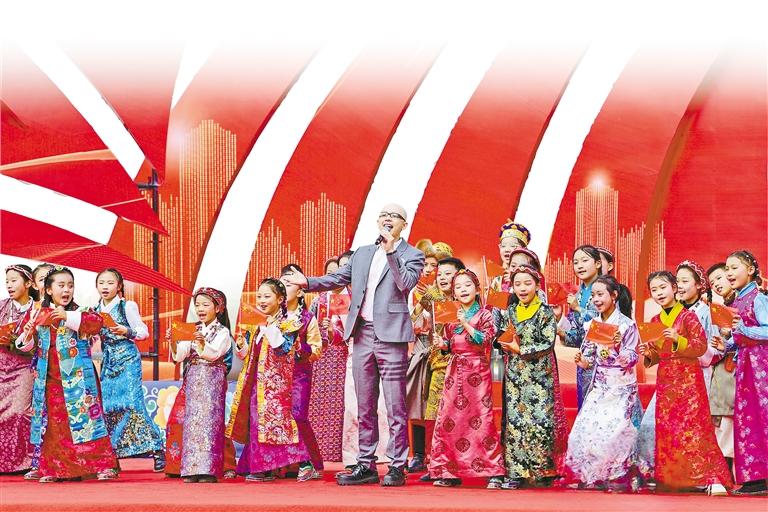 歌手平安與西藏珠峰少年合唱團(tuán)帶來(lái)歌曲《我愛(ài)你中國(guó)》。(其余圖片均由記者 唐斌 白瑪澤旺 王敏 丹增群培 旦增蘭澤 攝)