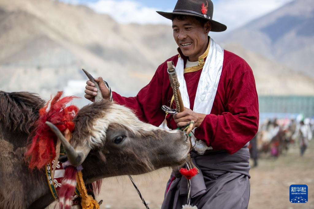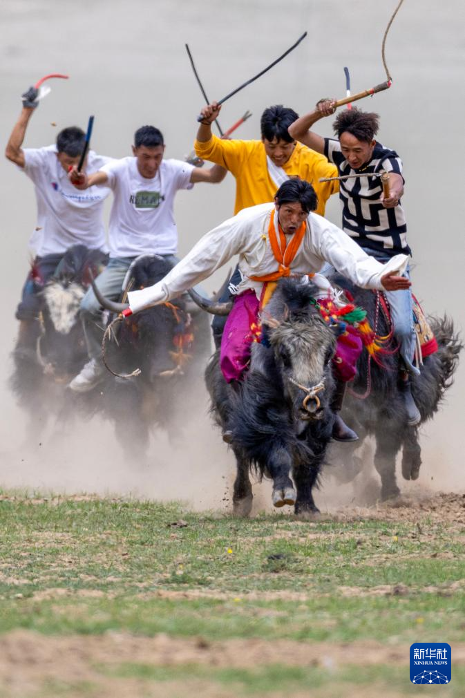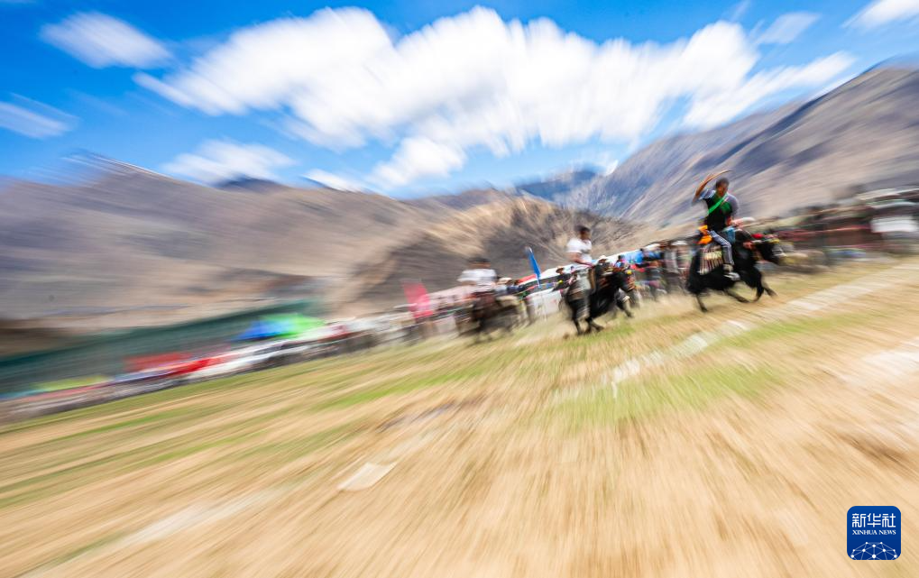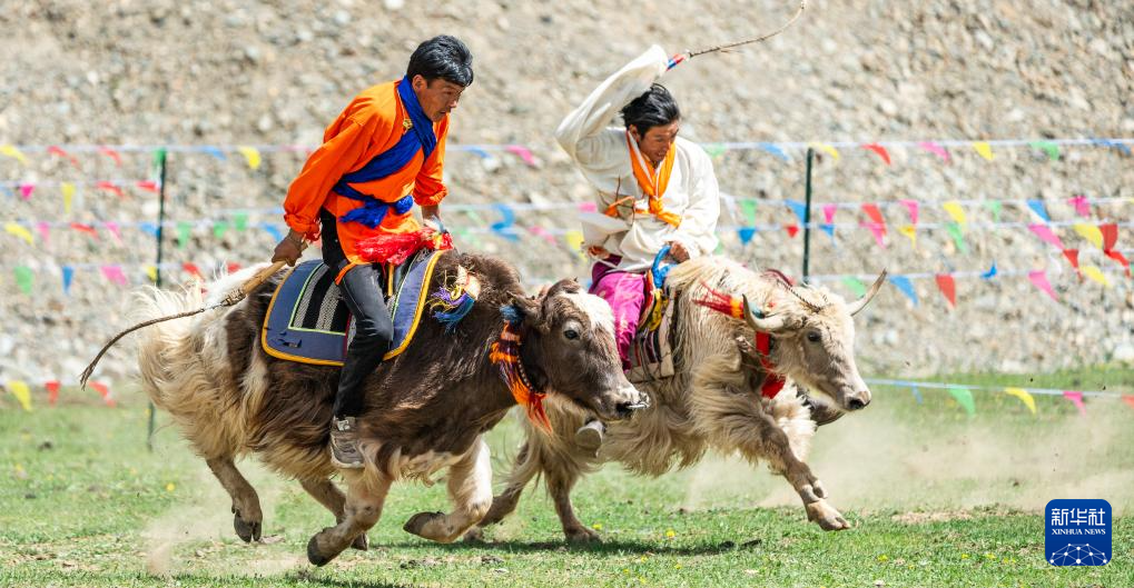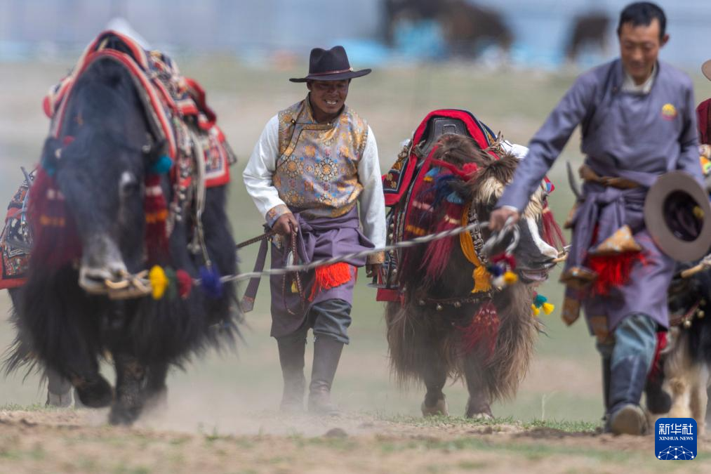 5月29日,當(dāng)?shù)剞r(nóng)牧民群眾在賽牦牛比賽中。新華社記者 丁增尼達(dá) 攝