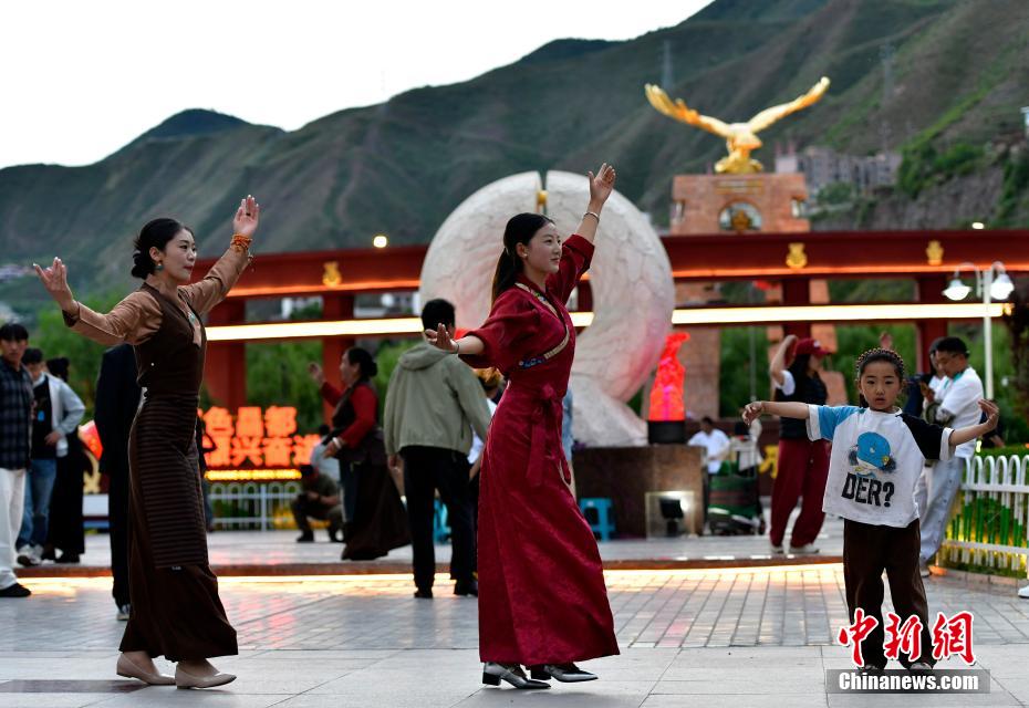 7月13日,西藏昌都瀾滄江天津廣場上,鍋莊舞愛好者踏歌起舞,舞出夏日夜間精彩。