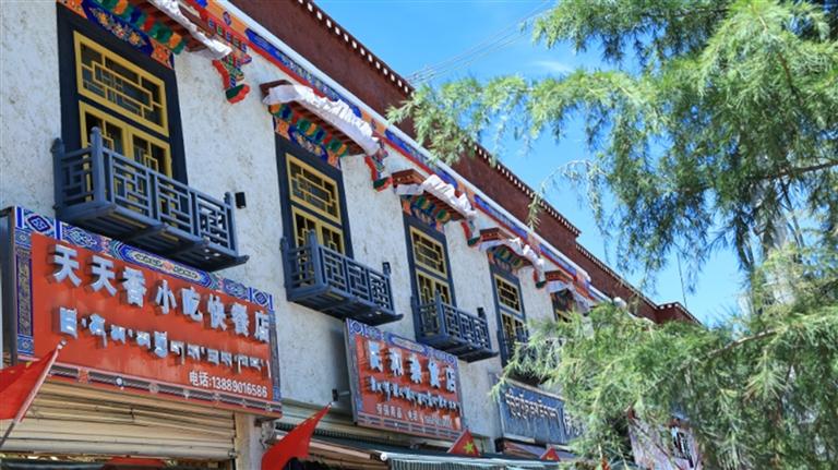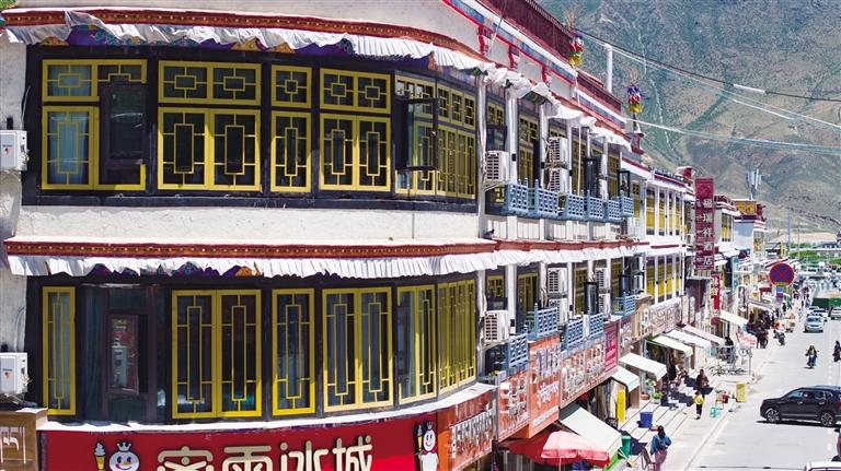 值得關(guān)注的是,此次修復及新建的商鋪外立面特意采用傳統(tǒng)藏式繪畫工藝,選用新藏式風格,旨在弘揚獨特的當?shù)匚幕?,使其在現(xiàn)代城市中展現(xiàn)新活力。通過外立面裝飾改造形成統(tǒng)一風格后,老舊街區(qū)的藏式特色更加凸顯。