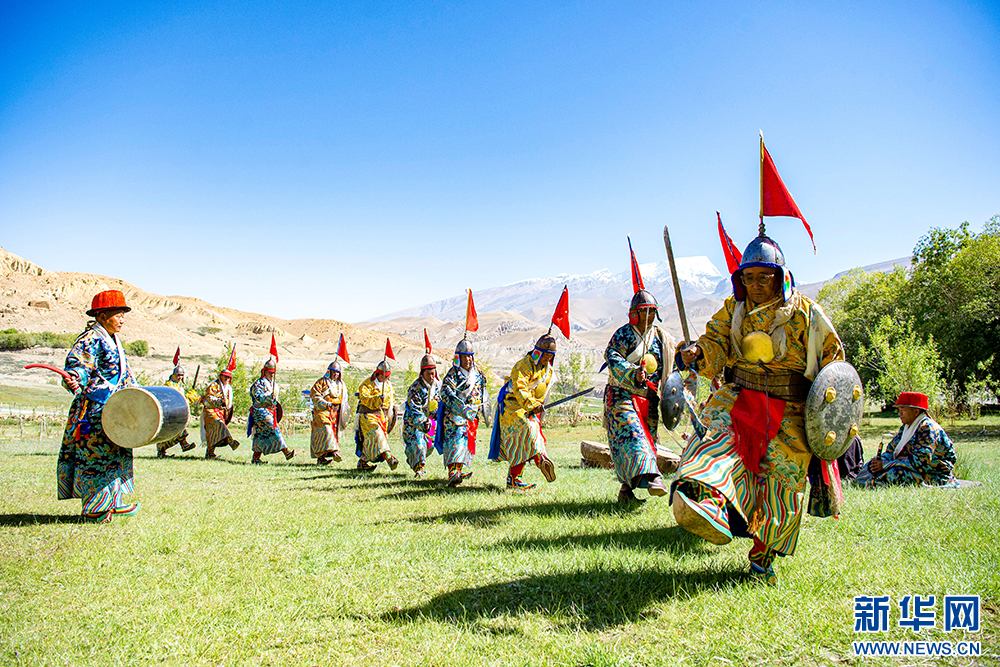 札達縣群眾在古格王國遺址腳下表演“宣舞”(6月12日攝)?!靶琛笔俏鞑匕⒗锩耖g傳統(tǒng)舞蹈,融合藏戲、舞蹈、說唱等傳統(tǒng)民間藝術(shù),內(nèi)容涵蓋禮儀、風(fēng)俗、節(jié)慶等。2008年,被列入國家級非物質(zhì)文化遺產(chǎn)名錄。新華網(wǎng) 旦增努布 攝