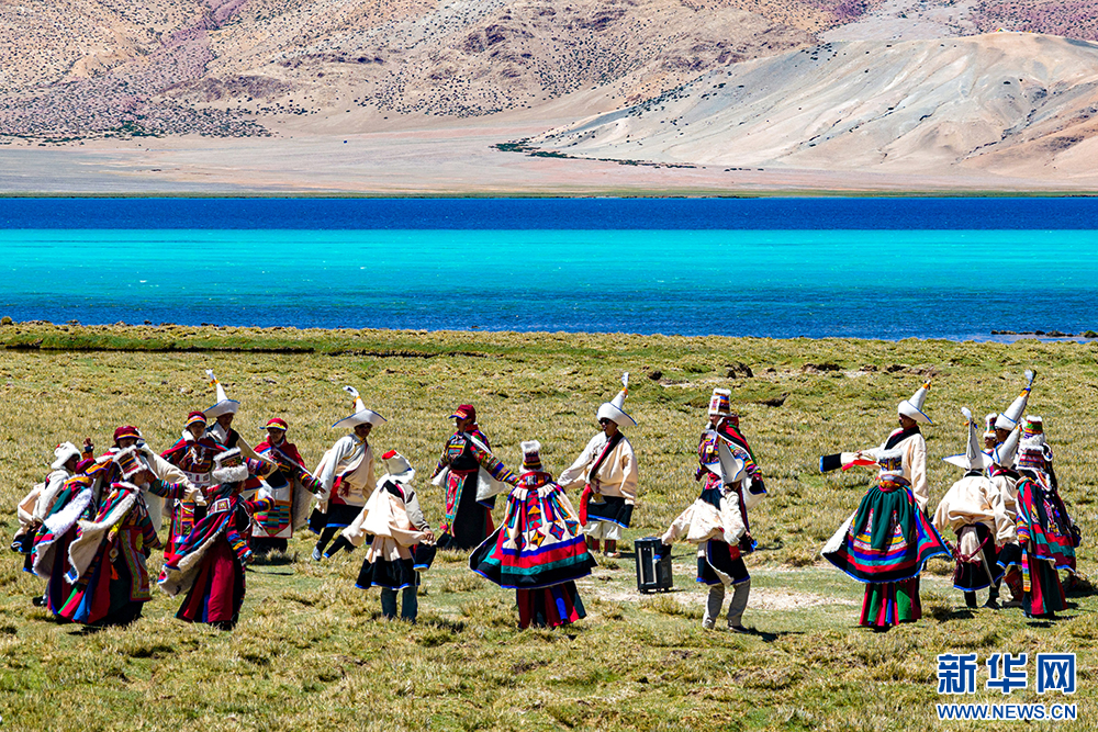 身穿自治區(qū)級非物質(zhì)文化遺產(chǎn)“森郭服飾”的改則縣群眾在湖畔跳鍋莊(6月21日攝)?!吧棥北蛔u為“五彩彩虹服”,主要由紅、綠、黑、黃、藍五種顏色的氆氌制成。新華網(wǎng) 旦增努布 攝