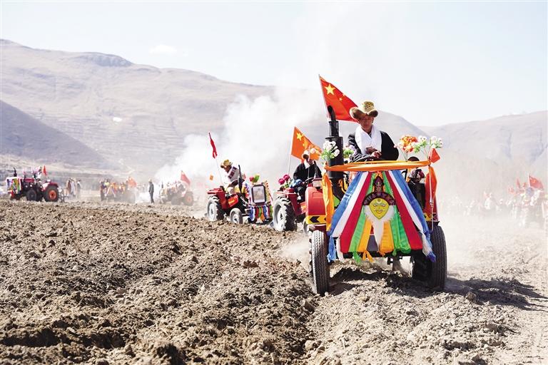 春耕儀式開始之前,犁手們依次吃糌粑、敬青稞酒、煨桑、獻(xiàn)哈達(dá),每個(gè)人臉上都流露著幸福的笑容?!拌F?!眰冊谔镩g一字排開,浩浩蕩蕩駛進(jìn)農(nóng)田,后面跟著盛裝打扮的姑娘,她們手持種子、肥料撒入農(nóng)田。這是來自春天的希望,希望秋收滿倉。