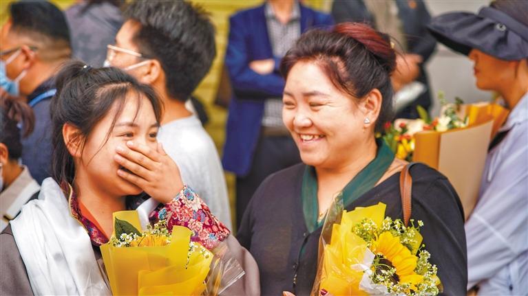 圖為家長為結束高考的考生送上鮮花。 記者 平措次仁 攝