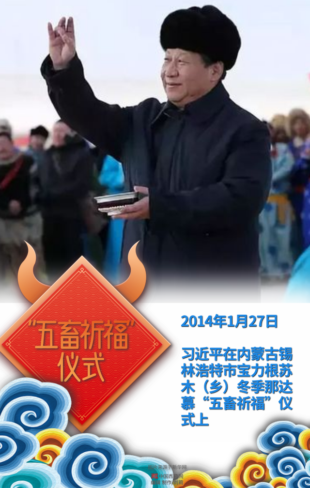 習近平在內(nèi)蒙古錫林浩特市寶力根蘇木(鄉(xiāng))冬季那達慕“五畜祈?!眱x式上