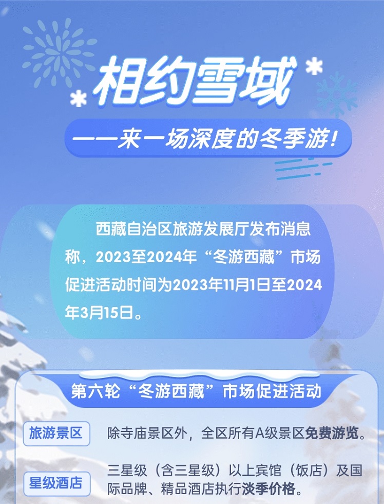西藏自治區(qū)旅游發(fā)展廳發(fā)布消息稱,2023至2024年“冬游西藏”市場促進活動時間為2023年11月1日至2024年3月15日。[詳細(xì)] -