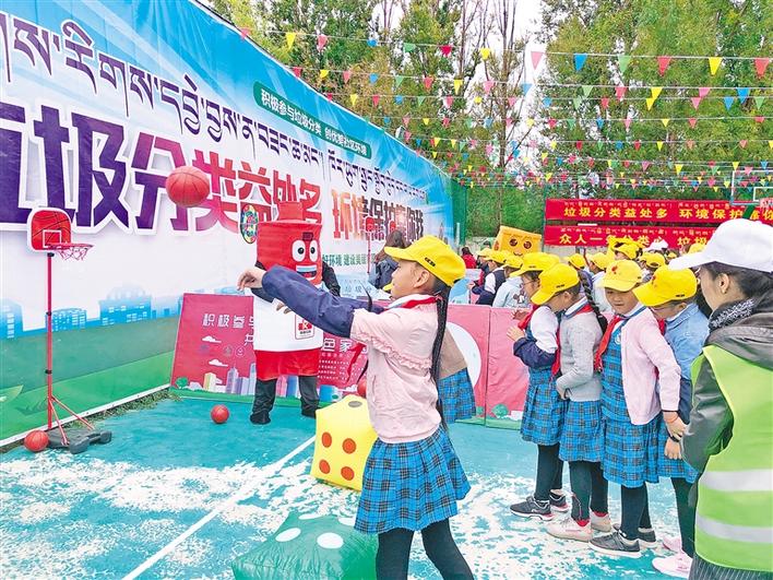 在拉薩市城關(guān)區(qū)組織開(kāi)展的“不忘初心、牢記使命”主題教育暨“垃圾分類(lèi)黨員先行 守護(hù)凈土人人有責(zé)”活動(dòng)現(xiàn)場(chǎng),學(xué)生代表參加趣味游戲。