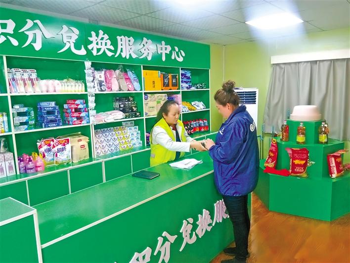 城關(guān)區(qū)嘎瑪貢桑街道辦事處統(tǒng)建社區(qū)居民在垃圾分類(lèi)積分兌換超市兌換生活用品。