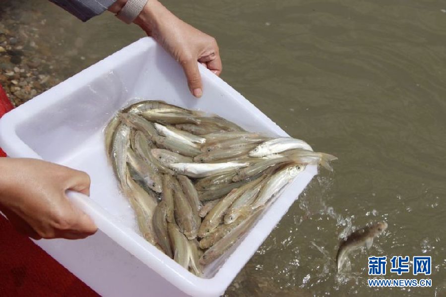 6月6日,當(dāng)?shù)厝罕妼⑶嗪:沲庺~苗投放到布哈河。新華社記者 周喆 攝