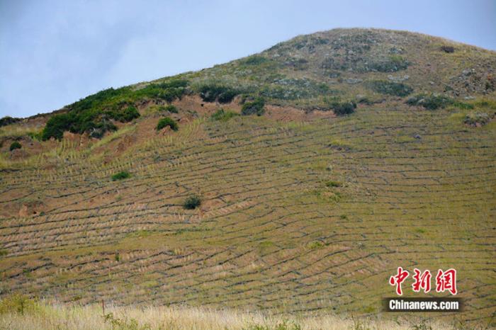 走進四川省阿壩州若爾蓋縣轄曼鎮(zhèn)西倉村治沙點,山坡上巨大的“棋盤”格外醒目??h林草局生態(tài)修復股助理工程師涂勝介紹,這是用于治理草原沙化的高山柳沙障。