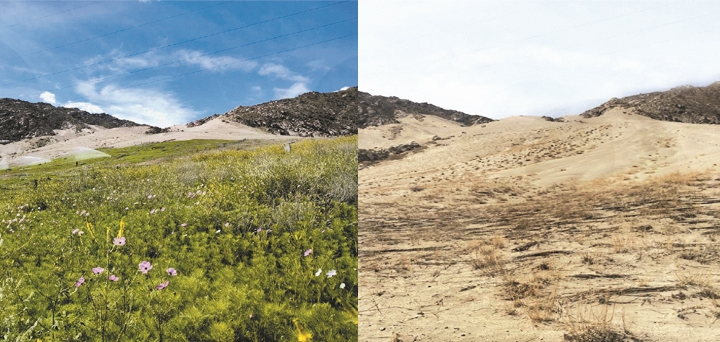 圖為空港新區(qū)防沙治沙與生態(tài)修復(fù)試驗(yàn)項(xiàng)目中同一處坡面生態(tài)修復(fù)前(右)與生態(tài)修復(fù)后(左)的對比。拉薩融媒記者 凃 瓊攝