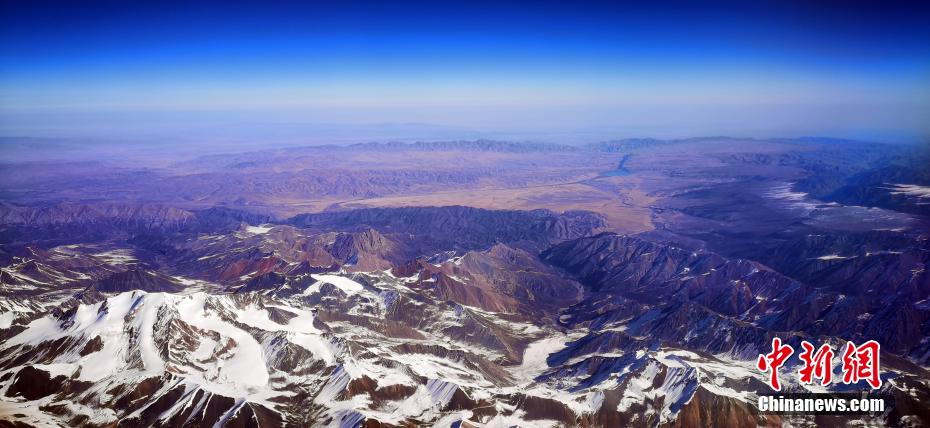 11月9日,記者從萬(wàn)米高空俯瞰祁連山,雪域之巔造型各異,氣勢(shì)恢宏的雪山棱角分明,在皚皚白雪的覆蓋下,山巔似撒了一把把“椒鹽”,陽(yáng)剛與陰柔之美相得益彰,高原湖泊如藍(lán)寶石般鑲嵌在祁連山脈,更有藍(lán)天、白雪、黃沙和諧同框的奇觀,宛如張張“水墨丹青”的油彩畫(huà),看“醉”空中旅人。 魏建軍 攝