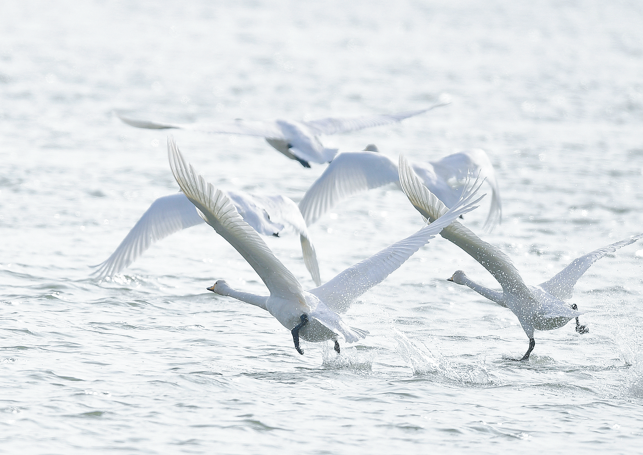 天鵝從黃河河面起飛。