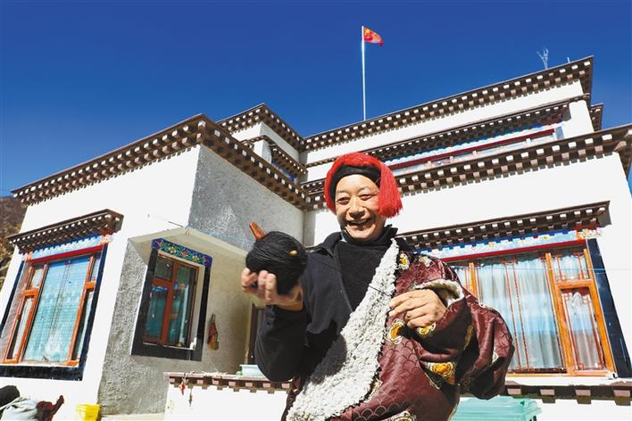 圖為墨竹工卡縣日多鄉(xiāng)怎村哈姆組牧民索朗巴珠在自家新房前紡牦牛線。洛??酥?唐斌 攝