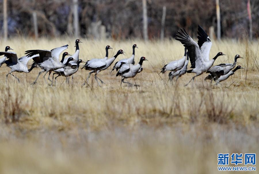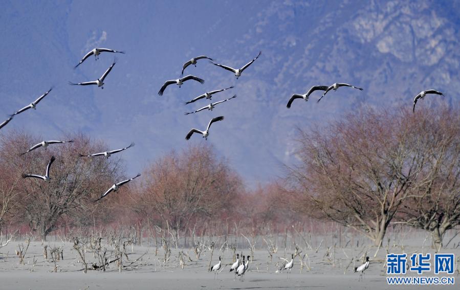 冬季,成群結(jié)隊(duì)的黑頸鶴遷徙到西藏林芝市,雅魯藏布江及江畔的農(nóng)田成了它們越冬的樂園。