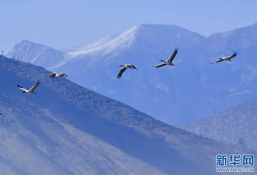 黑頸鶴飛翔在雅魯藏布江峽谷上空(2月1日攝)。新華社記者 張汝鋒 攝