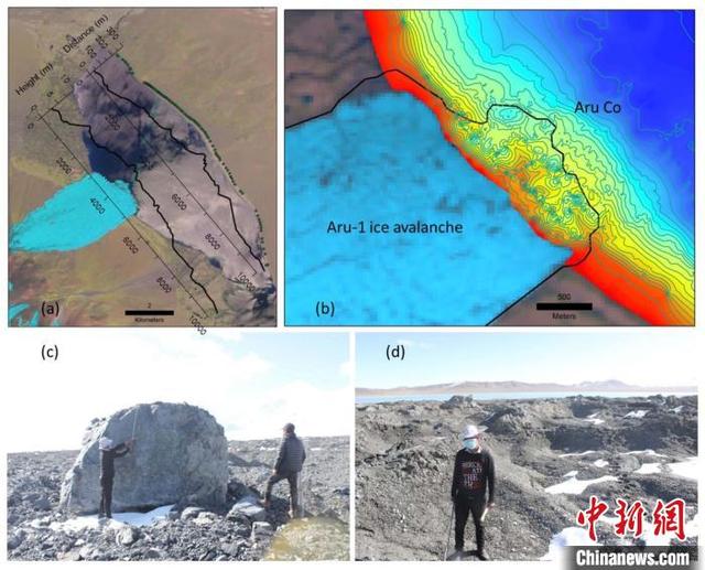 a。第一次冰崩在阿汝錯(cuò)產(chǎn)生的巨大湖嘯;b。大量碎屑物質(zhì)帶入阿汝錯(cuò),導(dǎo)致冰崩扇附近湖底地形產(chǎn)生顯著變化;c。冰體融化后冰崩扇上留下的巨石;d。大量碎屑物質(zhì)。中科院青藏高原所 供圖