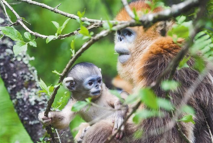 神農(nóng)架國家公園動物保護(hù)人員經(jīng)過多年的努力,加之當(dāng)?shù)厣鷳B(tài)環(huán)境的不斷改善,神農(nóng)架金絲猴由上世紀(jì)80年代的501只擴(kuò)大到現(xiàn)在的3個(gè)金絲猴大種群9個(gè)小種群,總數(shù)達(dá)到1471只。 這是5月19日在神農(nóng)架國家公園大龍?zhí)督鸾z猴野外研究基地山林中拍攝的金絲猴。 新華社記者 肖藝九 攝
