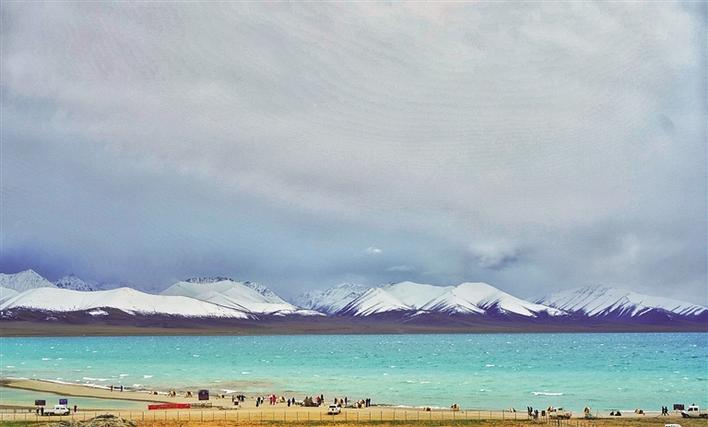從羊八井出發(fā)至當(dāng)雄縣,有一條向左的岔路,沿著這條路一直向前開約60公里,就能到達(dá)西藏最著名的景區(qū)之一——納木措。納木措,湖面海拔4718米,形狀近似長方形,東西長70多千米,南北寬30多千米,湖的東南部是直插云宵、終年積雪的念青唐古拉山主峰,清澈的湖水便來自念青唐古拉山融化的冰雪,北側(cè)則倚偎著和緩連綿的高原丘陵,廣闊的草原繞湖四周,似是將納木措小心翼翼地護(hù)在懷中。湖水顏色由罕見的碧藍(lán)與碧綠色相結(jié)合,是畫師都不易調(diào)出的顏色,遠(yuǎn)遠(yuǎn)望去,碧波粼粼的湖水與周圍的山脈、草原、藍(lán)天、白云交相輝映,令在場的人不禁連連感嘆仿佛置身于仙境之中。