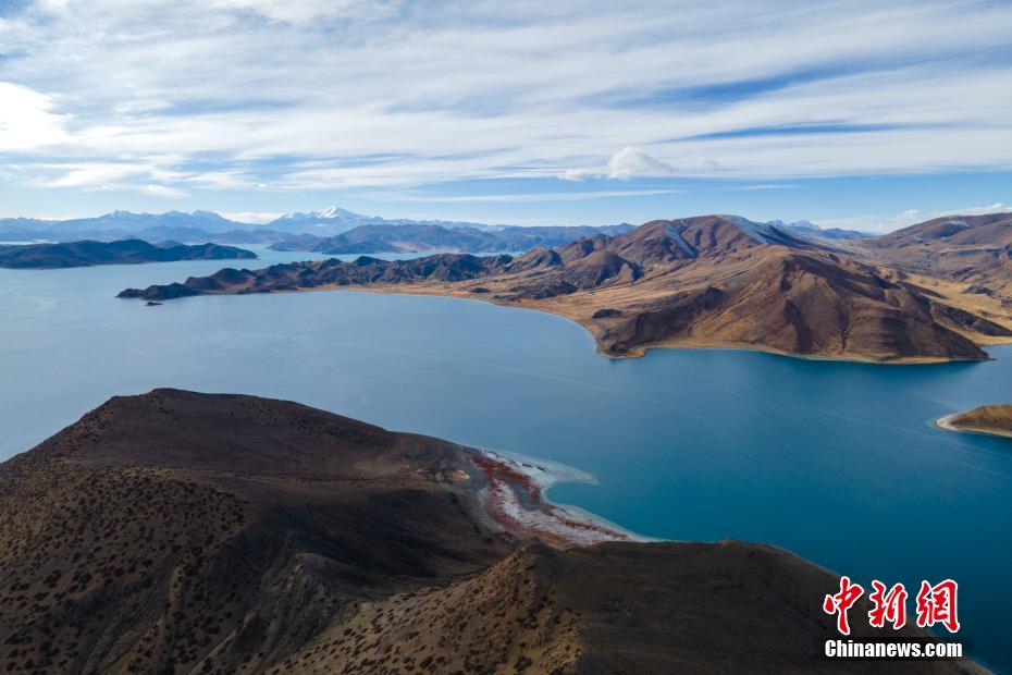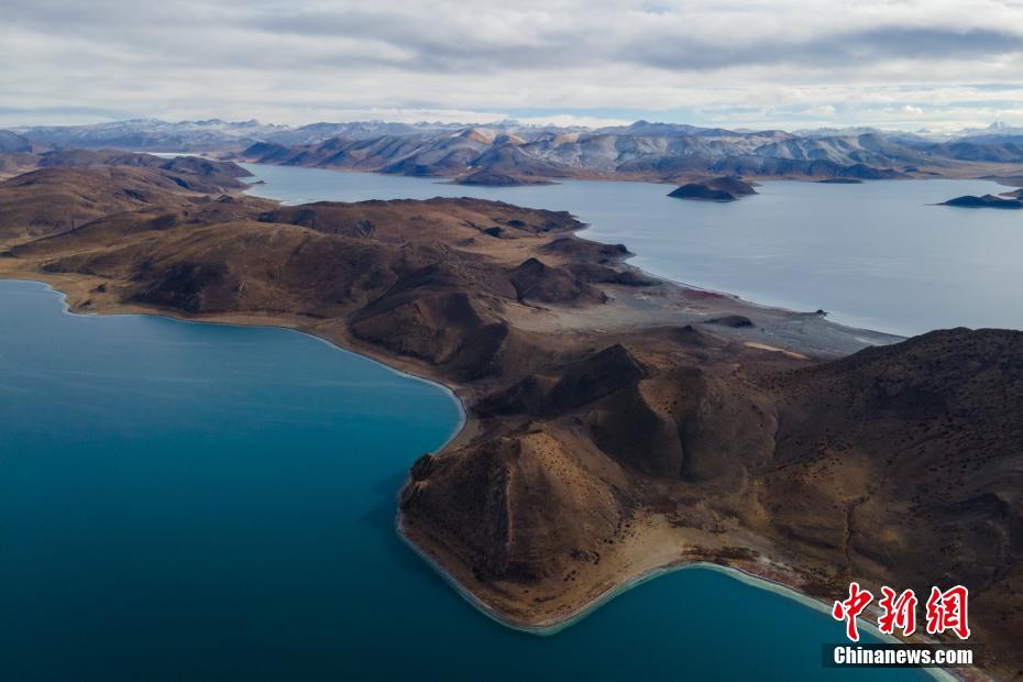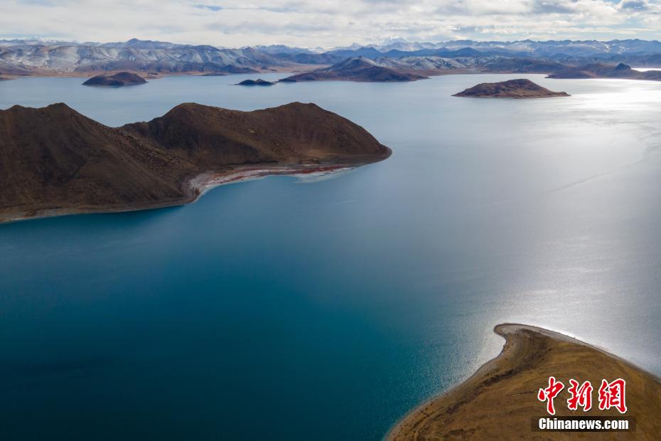 航拍羊卓雍錯與遠(yuǎn)處的雪山。 江飛波 攝