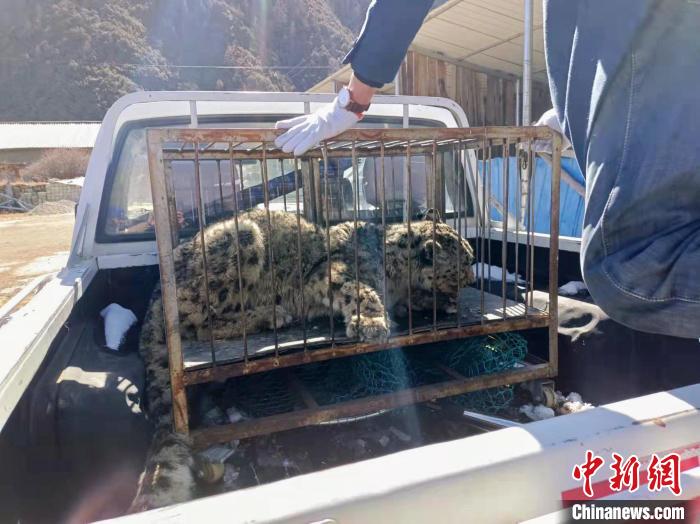 圖為工作人員將雪豹運(yùn)送至林芝市野生動(dòng)物收容救護(hù)站?!×种ナ辛植菥止﹫D
