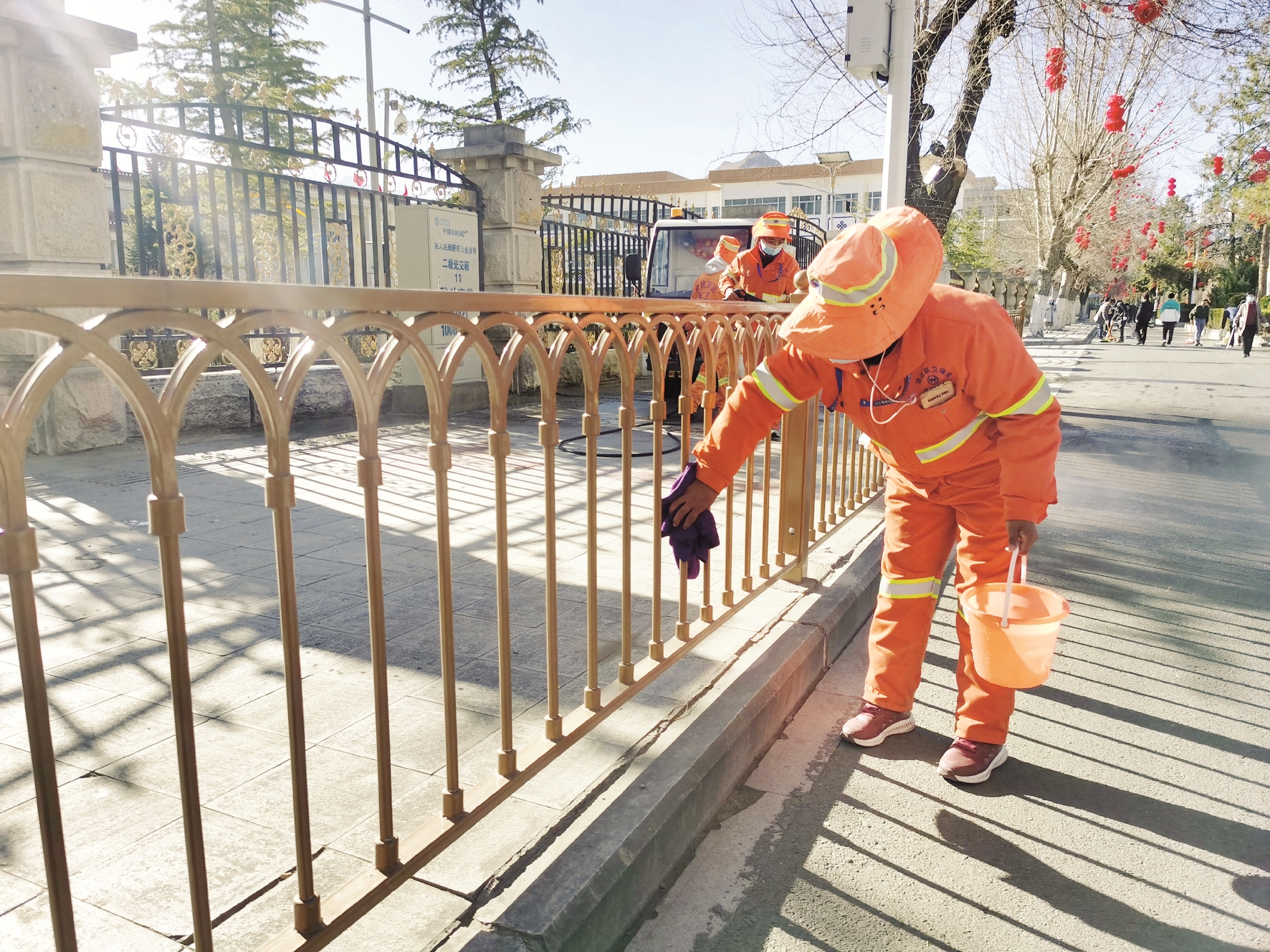 圖為環(huán)衛(wèi)工人在清理圍欄。 拉薩融媒記者 范江英攝