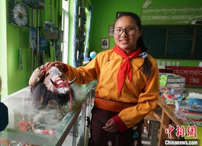 圖為學(xué)生展示用牛糞和牛毛制作的牦牛擺件。馬銘言 攝