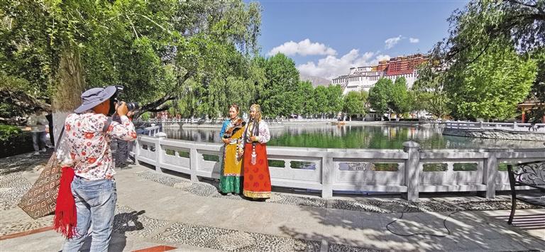 圖為近日,游客在拉薩市宗角祿康公園合影留念 。記者 唐斌 攝