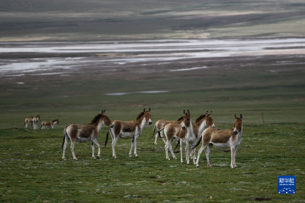 2021年7月25日,在三江源地區(qū),一群藏野驢在草原上活動。新華社記者 張龍 攝