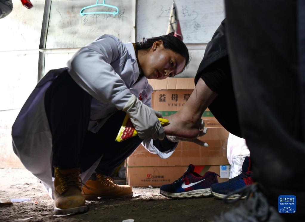 西藏那曲市比如縣良曲鄉(xiāng)然木塘村蟲草采集點(diǎn)的營(yíng)地里,政府為采集點(diǎn)配備的醫(yī)護(hù)人員在給采集蟲草時(shí)受傷的牧民治療(5月26日攝)。新華社記者 晉美多吉 攝