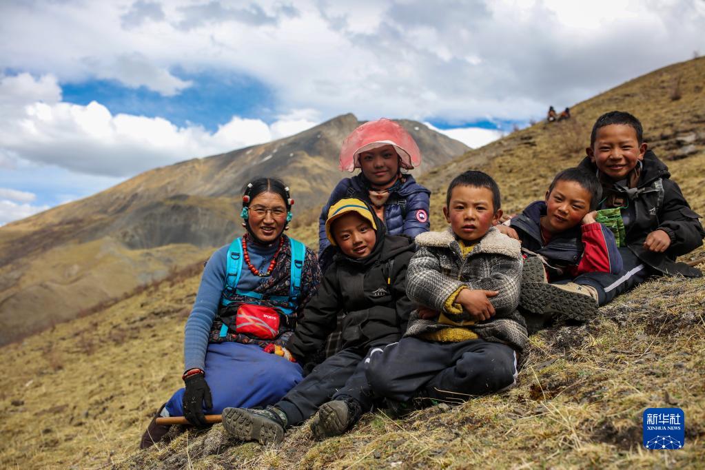 牧民其美嘎德(左一)在蟲草采挖間隙和當(dāng)?shù)匾恍┖⒆釉谝黄穑?月25日攝)。新華社記者 姜帆 攝