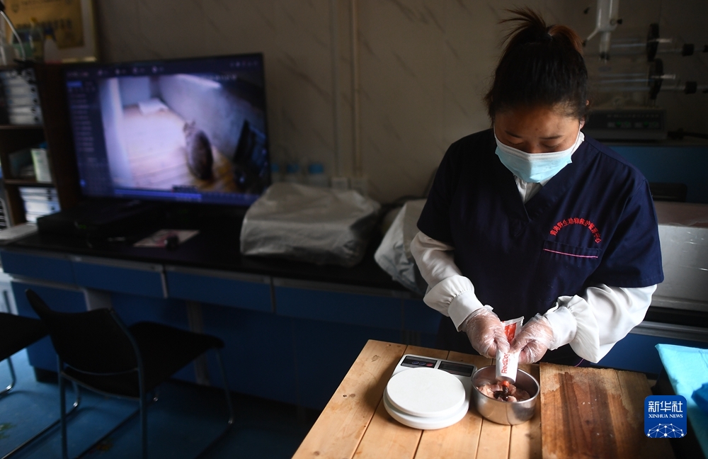 9月18日,青海野生動物救護繁育中心工作人員虎文蓉在給荒漠貓準備的晚餐中加入營養(yǎng)膏。新華社記者 張宏祥 攝