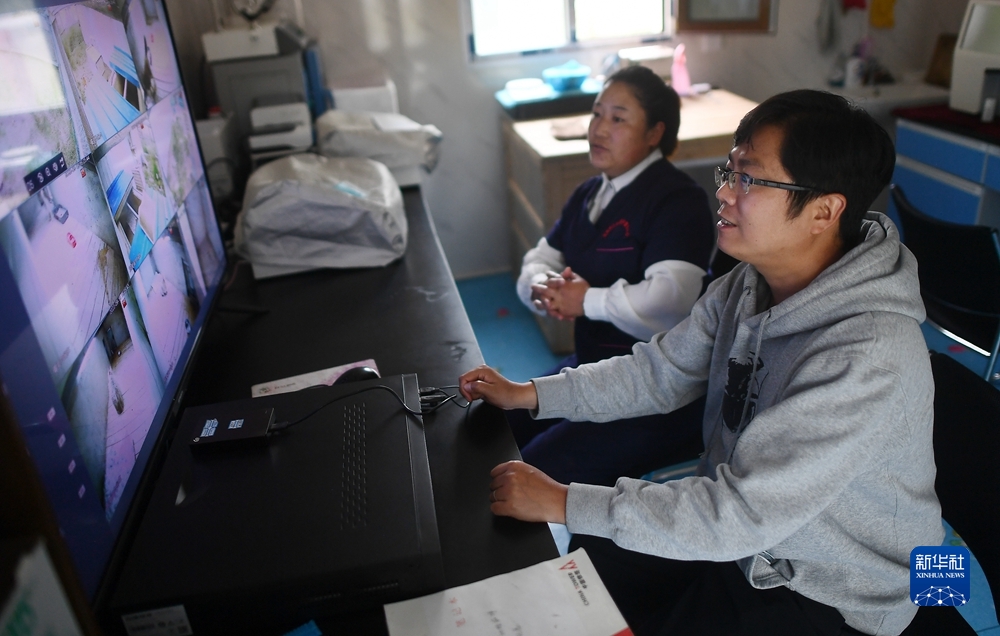 9月18日,在青海野生動物救護繁育中心,工作人員查看監(jiān)控,了解荒漠貓的進食情況。新華社記者 張宏祥 攝