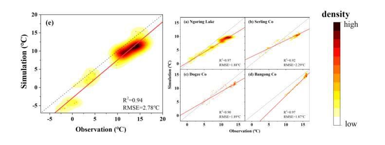 湖泊水溫是區(qū)域水分與能量平衡的重要變量,也是湖泊水生生態(tài)系統(tǒng)的控制性參數(shù)。由于常規(guī)地面觀測(cè)的局限,青藏高原湖泊水溫觀測(cè)數(shù)據(jù)普遍缺乏。團(tuán)隊(duì)集成遙感與數(shù)值模擬技術(shù),發(fā)展了水溫?cái)?shù)據(jù)重建的技術(shù)框架,突破了模型數(shù)據(jù)要求高而移植性差的局限,實(shí)現(xiàn)了多相態(tài)(冰、水、冰水混合)下湖泊水溫的動(dòng)態(tài)模擬,揭示了青藏高原湖泊水溫的時(shí)空演化規(guī)律及其對(duì)氣候變化的響應(yīng)。