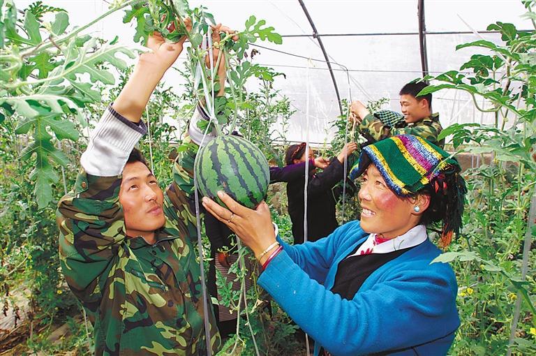 各族群眾廣泛交流、互幫互助、深度交融,共同創(chuàng)造美好幸福生活。圖為西藏自治區(qū)白朗縣彭倉村群眾與山東壽光技術(shù)人員共同種植的西瓜喜獲豐收。