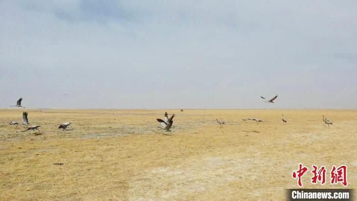 監(jiān)測顯示,格爾木市拖拉海草原是蓑羽鶴遷徙過程中的重要停歇地。每年十月初左右,少則數(shù)百只多達(dá)數(shù)千只蓑羽鶴都會聚集于此,補(bǔ)充能量,再蓄力南飛。它們在這里涉水覓食,振翅高飛,水草豐美的濕地為它們提供了歇腳的舒適環(huán)境。