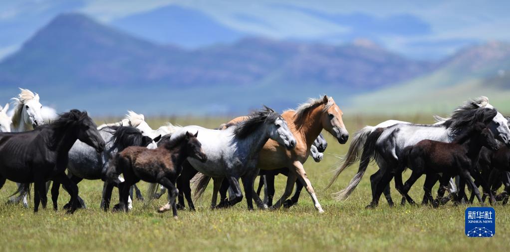 河曲馬在甘肅省甘南藏族自治州瑪曲縣河曲馬場(chǎng)的濕地奔跑(2019年6月22日攝)。新華社記者 陳斌 攝
