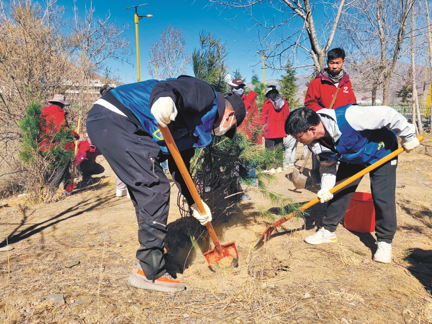 現(xiàn)場,志愿者手拿垃圾桶、夾子等工具,認(rèn)真清理地面上的垃圾。隨后,不同團(tuán)體志愿者被劃分為7個組開始植樹,大家干勁十足、配合默契,一起立苗、填土、澆水,有條不紊完成每道工序,并給每棵樹系上絲帶。經(jīng)過一番熱火朝天的勞動,一棵棵新栽下的樹苗昂然挺立,為初春的山坡增添了一片新綠?;顒娱g隙,大家相互交流,憧憬著多年后荒灘變青山的場景。